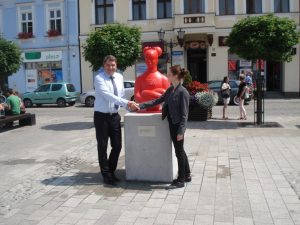 Agata Agatowska with the Mayor of Oswiecim Mr. Janusz Chwierut, Old Town Square, Oswiecim, Polen, 2016