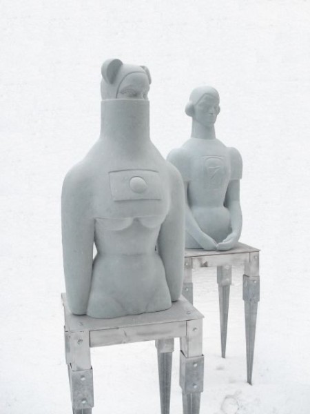 Miś Uszatek, 2008, mastic, 95x47cm; David Bowie Fanka, 2008, mastic, 98x45cm